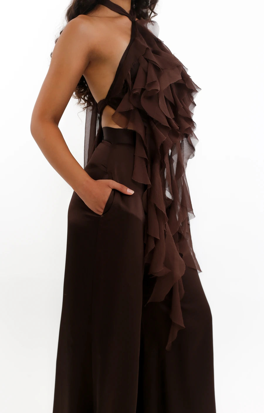 Satin diamond-cut top, adorned with long chiffon ruffles, featuring chiffon ties at the neck and back, with an elegant open back.